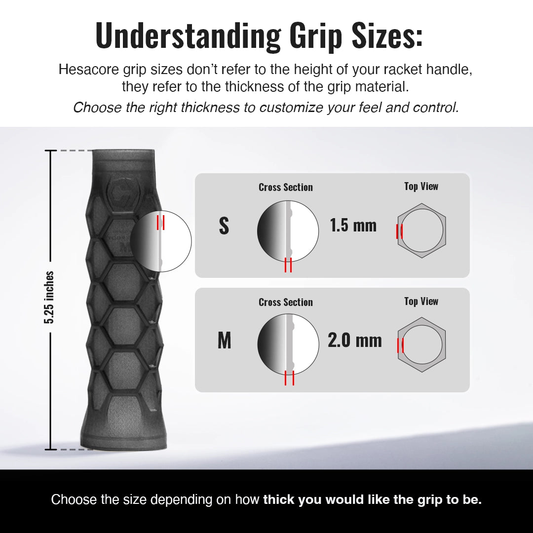 Yes, there are, Hesacore is available in two sizes: S and M. The size S is suitable for players who are used to using only one overgrip over the traditional grip. Size M is recommended for those players who usually use two or more overgrips over the traditional grip. In any case, we suggest always using only one overgrip over Hesacore and choose the size according to the size of the hand.